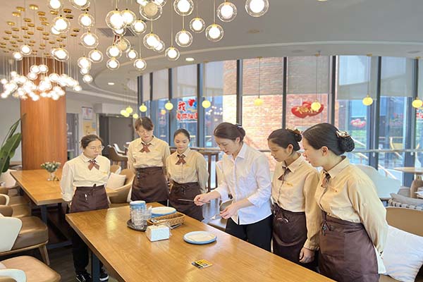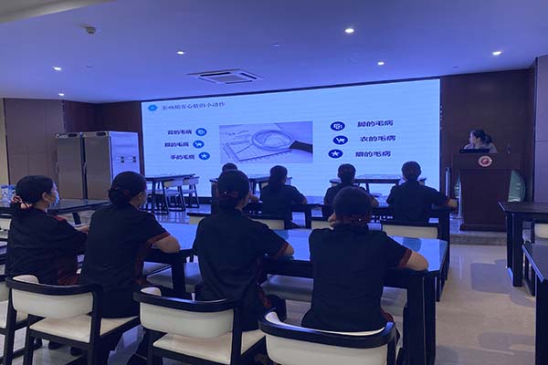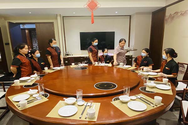 培訓(xùn)內(nèi)容包括理論知識和實操兩大部分,由各接待餐廳負責(zé)人根據(jù)餐廳實際,對員工進行儀容儀表要求、服務(wù)禮貌用語、擺臺注意事項、上菜技巧、處理投訴問題等綜合服務(wù)素質(zhì)理論培訓(xùn);實操培訓(xùn)包括擺臺、斟酒倒茶、餐巾折花、上菜、收臺等,并實景演練處理投訴問題。