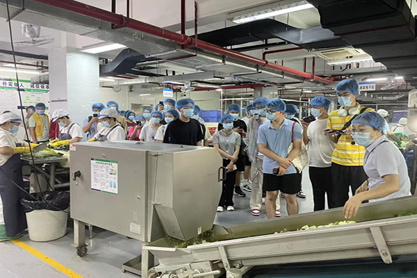 在監(jiān)管部人員的帶領下,同學們依此參觀了食材檢測室、凈菜加工中心、秀苑餐廳一、二樓后廚等,詳細了解凈菜加工中心和食堂后廚操作流程、原材料采購、存儲和食品加工制作流程及標準要求等,對食堂的管理要求有了更直觀的認識。