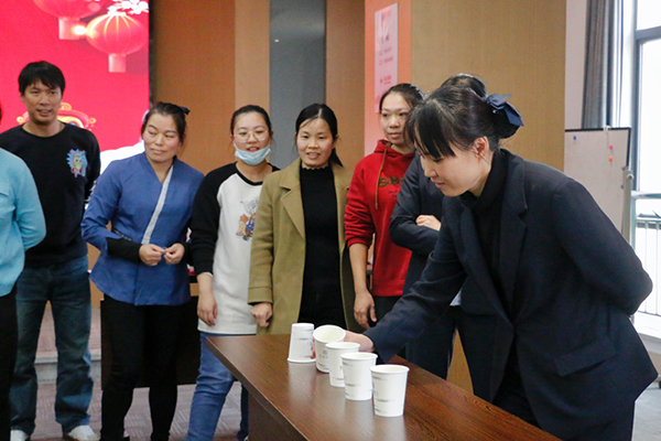 活動(dòng)設(shè)置了扣杯子、夾乒乓球、氣球運(yùn)杯接力、夾球往返、幸運(yùn)抽獎(jiǎng)等項(xiàng)目,全體員工通過抽簽隨機(jī)分成4個(gè)團(tuán)隊(duì)進(jìn)行比拼?,F(xiàn)場氣氛熱烈,員工熱情高漲、歡聲一片。?
